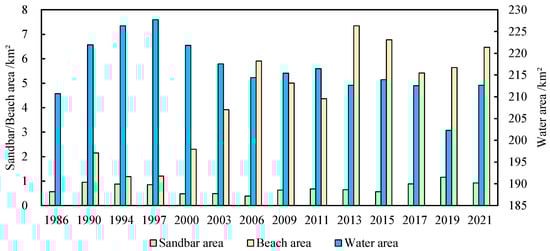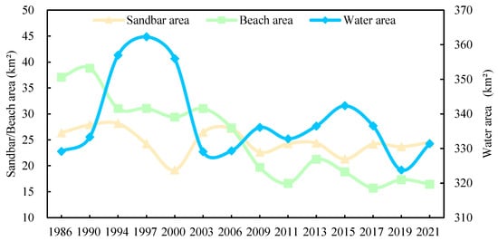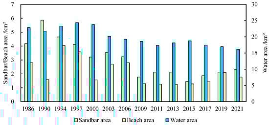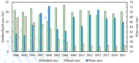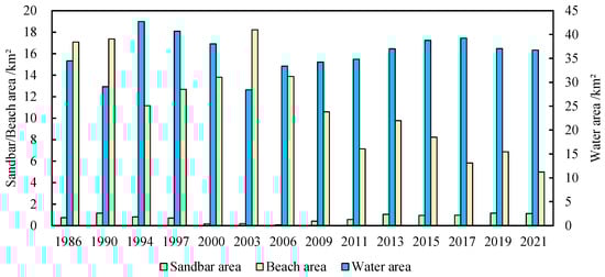 Figure 8 shows a distinct trend in the water area of the lower Minjiang River, with an initial increase, followed by a decrease and eventual stabilization. The water area increased during 1986–1997 and experienced a decline during 2000–2003. Since 2003, there has been a tendency toward stabilization in the overall water area, with the declines being comparatively smaller. The sandbar area has remained stable over the last 35 years, with an average annual area of 24.58 km2. In contrast, there has been a significant reduction in the beach area, which went from 37.09 km² in 1986 to 16.44 km² in 2021, representing a decline of approximately 20.65 km2.