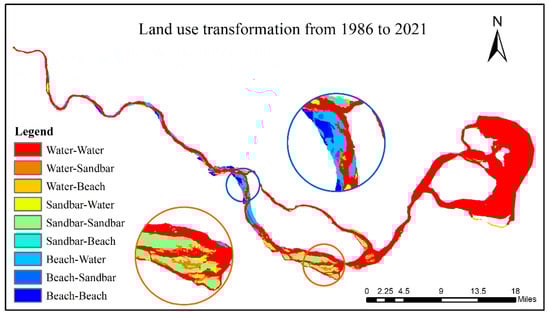 The transformation of land use during 1986–2021 can be observed in Figure 9, where the most significant change takes place in the NG section. Numerous beaches are converted into water bodies in the upper part of the NG section, and the change in river morphology downstream of the NG section is also complex, with major transformations between sandbars, beaches, and water bodies.