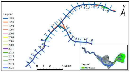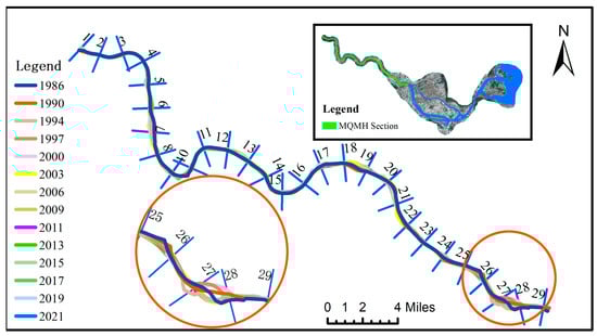 The primary channel of the MQMH section is narrow and elongated. To comprehensively analyze variations within MQMH, twenty-nine cross-sections (MQ1–MQ29) were established, and the evolution of each cross-section is illustrated in Figure 10. While the upstream segment of MQMH remains relatively stable, with minimal interannual variability in its main channel, there are more significant oscillations in the downstream areas at the river bends. Between 1986 and 2003, the river’s course in the MQ25–MQ29 cross-section exhibited significant fluctuations characterized by amplitudes exceeding 100 m, alternating between swings to the left and right banks. Since 2003, the river has been stabilizing, leading to a decrease in the overall amplitude of the river’s swing.