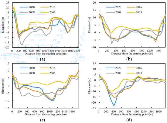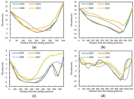 Topographical changes in cross-section in MQMH section (the starting point is located on the left bank). (a) MQ4; (b) MQ10; (c) MQ27; (d) MQ28.