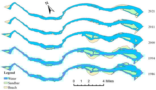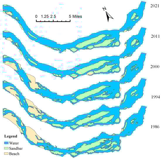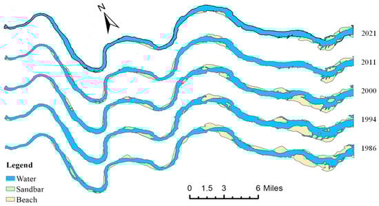 Distribution of water, sandbars, and beaches of the river in MQMH section.