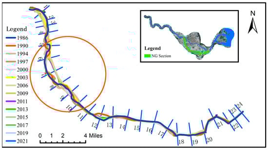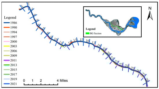 To understand variations in BG section, twenty-eight cross-sections (BG1–BG28) are established, and the corresponding layout and changes in width for each cross-section are illustrated in Figure 14. Differing from the MQMH section, there is an overall decreasing trend in the change in the channel width in the BG section. BG19 experiences the most significant shift in cross-sectional width, with a cumulative decrease of about 378 m over the past 35 years. In contrast, BG4 is observed to be the most stable section, exhibiting a cumulative change of only 259 m over the same period. Ultimately, the river’s average width has decreased by approximately 200 m from 1986 to 2021, dropping from the initial measurement of 708 m to 500 m.