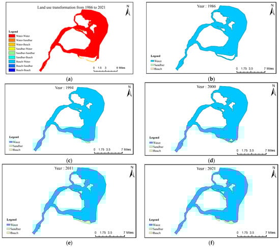 Between 1990 and 1994, there was a particularly drastic exchange between beaches and water, with approximately 12.25 km2 of beaches being converted into water, while the area transformed into sandbars during the same period was only 0.73 km2. From 1994 to 2000, 9.90 km2 and 7.40 km2 of sandbars and beaches were converted into water bodies, respectively. However, there was a significantly decreased area of water bodies during 2000–2006, with about 10.35 km2 and 9.95 km2 converted into beaches and sandbars, respectively. Over the period of 2006–2021, there was relatively less variation in land use changes, with the conversion between all types of parcels remaining within 5 km2.