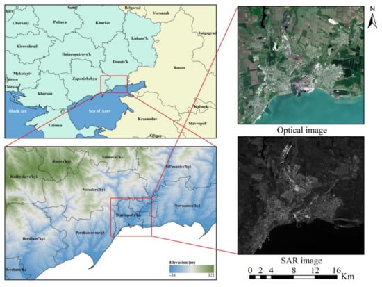 Located in the South of the Donetsk Prefecture and borders the Sea of Azov, it connects the Donbas region to the Crimean Peninsula. Mariupol is the second-largest city in Donetsk Prefecture and the tenth-largest city in Ukraine, the essential sea-land traffic control hub, and an industrialized town for metallurgy, machinery and trade. Mariupol extends from 47°1′26″ N to 47°13′19″ N latitude and from 37°27′41″ E to 37°47′17″ E longitude, covering an area of 244 km2. Topographically, it is part of the Sea of Azov lowland, without any mountains or hills, and the elevation of the surrounding farmland is slightly higher than that of the central city. The urban land is mainly concentrated at the mouth of the central Karimius River, with good shipping resources, coupled with its historical coal mining, iron and steel industry heritage, make it a strategic port city. As of the end of 2021, Mariupol had a population of 431,859, with an urban area of 166 km2 and a downtown area of 106 km2 [27]. Figure 1 shows the geographical location of the study area and optical and SAR images of the corresponding area.