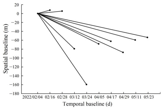 The Sentinel-1A satellite launched by ESA was used to map the change in urban building damage. It is a C-band () medium-resolution SAR satellite with four imaging modes: Stripmap (SM), Interferometric Wide Swath (IW), Extra-Wide Swath (EW), and Wave (WV), with a revisit period of 12 days [38]. We acquired Sentinel-1A single look complex (SLC) images in IW mode from the Alaska Satellite Facility [39] from 4 February to 23 May 2022. These images are all descending orbit images with both VH and VV polarization, and the spatial resolution is 5 m × 20 m. The temporal and spatial baselines between Sentinel-1A image pairs adopted in the study are shown in Figure 3; the positive and negative of the spatial baseline represent the difference between the baseline direction and the defined positive direction.
