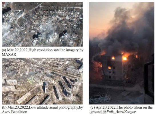 The vector data of buildings, land use types and roads used in the experiment came from the Open Street Map (OSM) platform [40]. These data contributed by platform registrants have the characteristics of inconsistent timeliness and complete alignment between the vector boundary of buildings and ground objects in satellite images. However, we tend to pay more attention to macro-scale damage and its change trend in large-scale armed conflicts. In medium-resolution images, a slight deviation of the building vector will not significantly impact the evaluation results, so we allow such errors. In addition, we have collected a large number of live photographs of the damaged buildings in Mariupol on the Internet platform (these images are from the shared dataset of high-resolution commercial remote sensing satellites [41] and aerial photography from drones, as well as from the ground, as shown in Figure 4) [42,43], and determine its spatial location and damaged degree, and finally, as samples to evaluate the damaged degree of whole urban buildings.