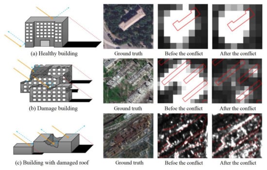 In SAR images, buildings in different states have completely different scattered structures. Figure 6 illustrates common types of damage and the corresponding SAR intensity images before and after the damage occurred. (a) is a healthy building, usually with strong backscattering due to the presence of dihedral angles, specular reflection occurs on the roof, and the walls block the signal to form shadows. (b) is the damaged building, the roof and wall collapse formed a disorderly distribution so that the SAR echo signal lost the rule, and the backscattering intensity was significantly weakened. (c) is the damaged type of some large warehouses or factories. The top of the building is damaged, but the rest of the structure is relatively intact. The residual walls and ground may form an angular reflector and cause a strong double-reflection effect [46], and the backscattering intensity is enhanced.