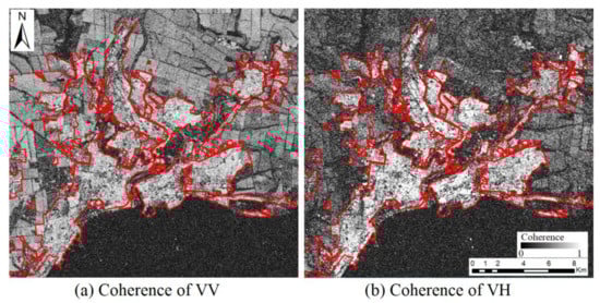 The damaged buildings in conflicts can be detected more robustly by synthesizing different polarization modes. In this study, The DPNCI was constructed by a weighted combination of the coherence maps in the VV polarization and VH polarization modes. We selected two SAR images before the conflict, with the image on 4 February 2022, as the master image and the image on February 16 as the slave image, and calculated the coherence coefficient within the artificial building land (Red Area in Figure 7, land types include: commercial, construction, education, gas station, factory, military, religious and residential). In Figure 7, (a) and (b) are VV and VH polarization coherence maps.