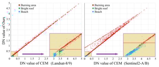 To verify the effectiveness of our method, we randomly selected a number of combustion areas and confusing objects (beach and highlighted building tops) on two types of optical images and compared the response values before and after the method improvement. As shown in Figure 8, IFB-CEM can significantly suppress the response values of non-burning areas in Landsat-8/9 and Sentinel-2A/B images and amplify the response values of some pixels in burning areas, which has a more obvious effect in Sentinel-2 images. (These pixels are usually burning centers, and their response is low in the original CEM algorithm due to the saturation of their response at bands 11 and 12 of Sentinel-2A/B’s sensor). In the local figure at the bottom right corner of Figure 8, IFB-CEM (split by horizontal lines) eliminates background interference to a greater extent and preserves target pixels more completely.