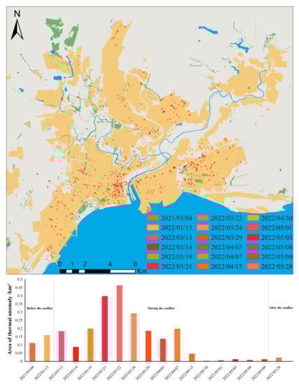 Figure 9 shows the temporal and spatial distribution of burning areas during the conflict. Before and at the beginning of the conflict (before 14 March 2022), the thermal anomalies were distributed in the Ilyich Iron and Steel Works in the north of the city and the Azovstal Steel and iron works in the south of the city, indicating that the production and living activities of the residents were proceeding normally. Images from 14 March showed that the thermal anomaly in the factory area disappeared, meaning that industrial production had to stop due to suffering attack and that all the thermal anomalies since then have been ground objects burning due to the conflict. The Russian forces mainly attacked from east, west and north three directions. The burning area of the city increased dramatically in a short time, showing a trend of gradual encirclement and contraction towards the city center. By the end of March, Russian forces had largely completed the siege of the Azovstal steel and iron works, after consolidating their positions in the city center, had launched an offensive against the Ukrainian 36th Marine Brigade stationed at the Ilyich Iron and Steel Works in the north and had captured the city hall of the Kalmiusky district. In early April, Russian forces began advancing southwest from the city center toward the coast in an attempt to encircle and eliminate Ukrainian forces in the port area, and the burning area shifted accordingly. By the end of April, the thermal anomaly area in the urban area was reduced to the lowest level, and the remnants of the Ukrainian army all retreated to the Azovstal steel and iron works. The Russian army had taken full control of the urban area of Mariupol, and the subsequent fighting basically centered on the Azov steel works, so the burning areas were located in and around the plant. Ukrainian forces surrendered on 16 May, and Sentinel-2A satellite imagery on 28 May showed no burning area in or around the Azovstal steel and iron works, bringing the nearly three-month battle for Mariupol to an end.