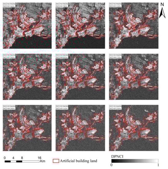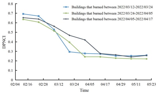 In Figure 12, the different colored line segments represent the average DPNCI value changes of the burned buildings over three different time periods. The blue line showed the largest decrease in coherence between 12 March and 24 March and remained at a low level, while the green and black lines also showed the largest decrease in coherence between 24 March and 5 April, 5 April and 17 April, respectively. It is proved that this method can accurately detect the time node of damaged buildings.