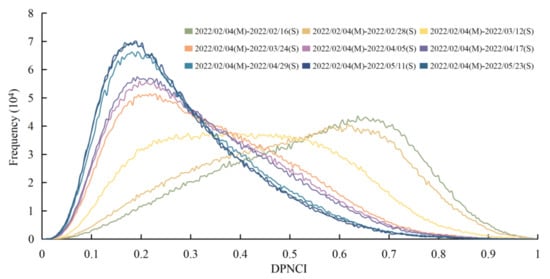 The frequency distribution of the DPNCI in the artificial building land is shown in Figure 11. Its distribution gradually changes from the right skew (before the conflict) to the left skew (after the conflict), and the average coherence keeps decreasing. Especially between 12 March and 24 March, the artificial building showed significant decoherence.