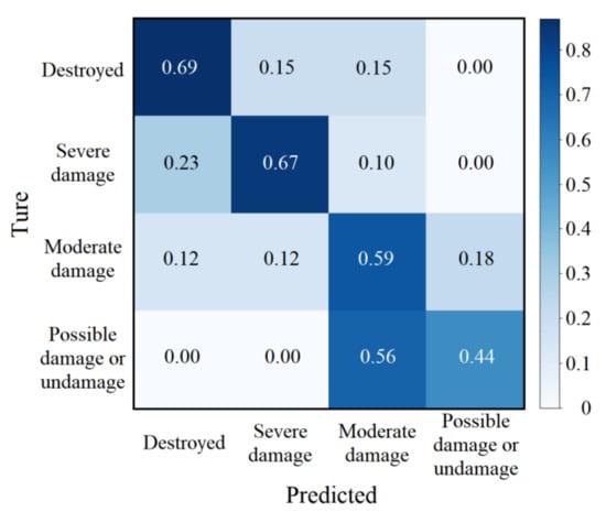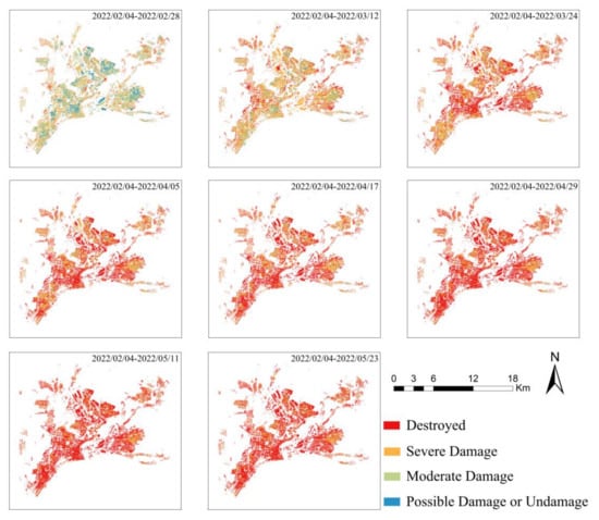 In order to quantitatively describe the damaged degree and spatial and temporal distribution of buildings in Mariupol, we graded the damage degree and geographically located 543 buildings in the collected images and photos. Four damaged levels were divided according to visual interpretation, as shown in Table 2. 80% of the buildings were selected to determine the classification threshold, and the remaining 20% were used as verification data. The confusion matrix of inspection results is shown in Figure 13, among which the classification accuracy of destroyed buildings is the highest, reaching 69%, and the overall accuracy is 59.75%.