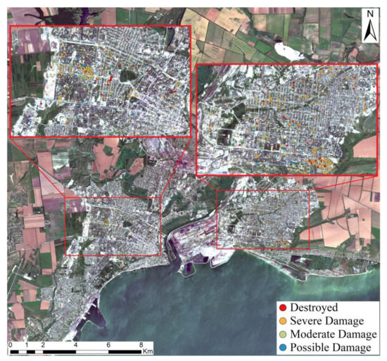 - Damage Assessment Overview Map—Livoberezhnyi and Zhovtnevyi Districts, Mariupol City, Ukraine. Available online: http://unosat.org/products/3371 (accessed on 24 April 2023).