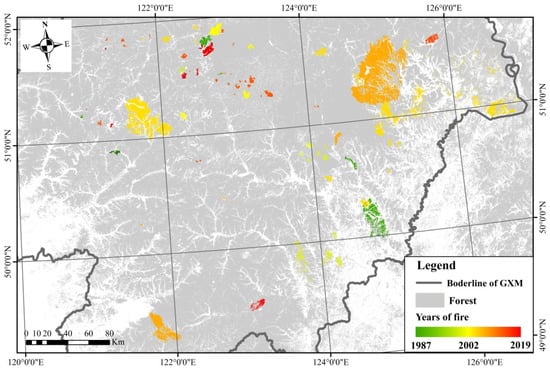 Spatial distribution of burn patches by the year of detection across the Great Xing’an Mountain.