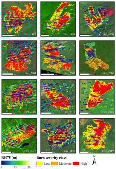 The examples of burned severity maps with GEDI footprints are shown in Figure 2. Most of the fires appeared in red tones indicating that a high proportion of high burn severity class has occurred (Table 3, Figure 2). These maps were used to stratify the GEDI samples for tracking the temporal patterns of the forest at different burn severity levels. RH75 metrics tend to be lower in the burned areas, especially in the high burn severity class. These GEDI footprints were also used as a region of interest to extract burn severity levels and pre-fire canopy cover openness for further statistics.