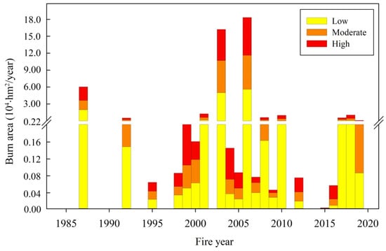 Annual statistics of the burned area across burn severity class in the study region from 1986 to 2019. The break interval omits the value from 0.2 to 0.21 × 104 hm2 and the interval is subsequently increased from 0.22 to 3 × 104 hm2/year.