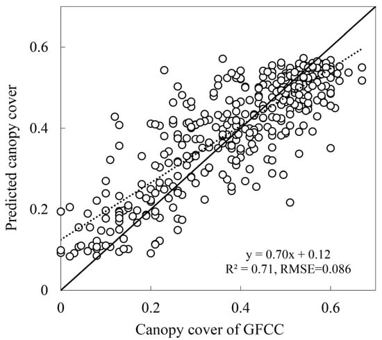 In order to encompass the diversity of vegetation characteristics, a series of spectral bands, spectral indices, and TCT were used to develop the RF classification. RF is a machine learning technique that exhibits improved performance in dealing with high-dimensional regression issues []. In this study, a total of 14 candidate variables were used for the RF model establishment (Table 2). After the best variable subset has been selected, we established an RF regression model to estimate the canopy cover. The RF regression algorithm is based on bootstrap resampling and the decision tree method, which is controlled by three key parameters: the number of decision trees (Ntree), the number of node splits per tree (Mtry), and node size. The accuracy of model prediction was validated by independent samples using the coefficient of determination (R2) and the root means square error (RMSE). The R-package Random Forest (version 4.6-14) regression procedure was used to complete this analysis.