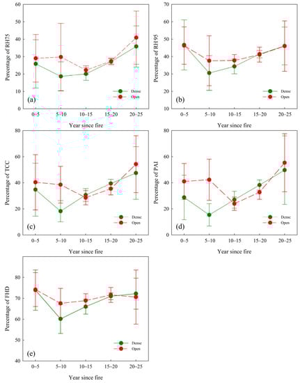 Percentage indices for dense and open patches in each year since the fire group, with error bars displaying the standard deviation range. (a) Percentage of relative height in 75th percentile; (b) Percentage of relative height in 95th percentile; (c) Percentage of total canopy cover; (d) Percentage of plant area index; (e) Percentage of foliage height diversity.