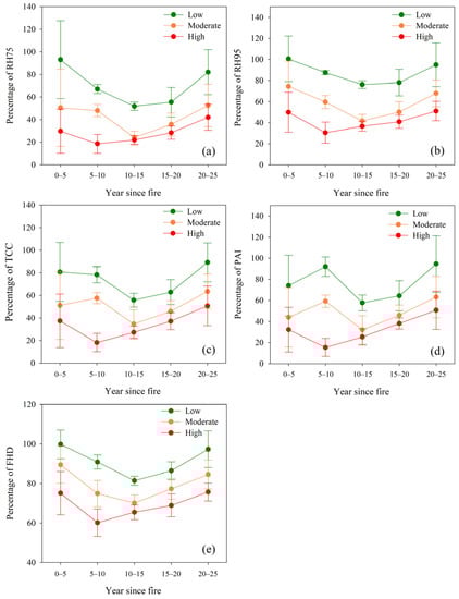 Three canopy indices were used to describe the pattern and extent of forest structure recovery (Figure 5c–e). TCC and PAI indicate similar recovery trends (Figure 5c,d) for both open and dense forests. The open forest indicates a delayed recovery with percentages lowest at 10–15 YSF compared with 5–10 YSF for dense forest. The dense forest recovery trend is faster in the 5–10 YSF and 15–20 YSF periods but slower between the 15–20 YSF and the 20–25 YSF periods. Although the declines of TCC and PAI are higher than stand tree height, TCC and PAI have significantly faster recovery trends than the tree height indices and increased sharply between 15–20 and 20–25 YSF for open patches. In contrast, FHD has the smallest change relative to an unburned area with the lowest percentage of 53% for dense forests and 57% for open forests. FHD of the open forest shows no significant recovery trend after a fire compared with the dense forest.
