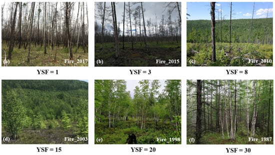 In the past three decades, over 2.5 million hectares of forests have been damaged by wildfires across the Great Xing’an Mountain region. These high intensity and frequency fire events have significantly altered forest structure, causing direct carbon emission from forest fire of about 0.48 Tg carbon year−1 [,,]. Understanding post-fire forest structural response is crucial for sustainable forest management, as it impacts a wide range of ecosystem processes []. However, follow-up management such as removal of burned wood, replanting of seedlings, fertilization, and irrigation, etc., is often limited, leading to the gradual degradation of burned areas into large, low-productivity forests, particularly those initiated by lightning strikes in remote regions that are difficult to access. Therefore, characterizing post-fire forest structure recovery under various environmental conditions is challenging to achieve through field investigation alone.
