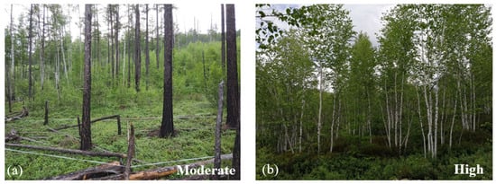 The examples of field photos taken in the summer of 2018 for moderate- (a) and high- (b) burn severity plots in the 2003 fire site.