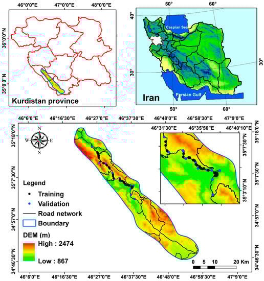 The study area is situated in Iran’s western Kurdistan province, with eastern longitudes ranging from 46°21′01″ to 46°57′24″ and northern latitudes ranging from 34°45′52″ to 35°19′35″. The area covers approximately 775.72 km2 (Figure 1). The length of the Kamyaran–Sarvabad road is around 97 km. The minimum and maximum elevations above sea level are 867 and 2474 m, respectively. The mountainous Kamyaran–Sarvabad road has a large number of sloping movements, including falling rocks and landslides. Due to its mountainous nature, the ridge is covered with snow and temporarily blocked on some winter days. The research region is situated in the Sirvan drainage basin, which is a part of the Sanandaj–Sirjan and Zagros structural zone. Rock outcrops from the Cretaceous to the Quaternary are included in bedrock lithologies. The majority of the research sites are composed of rocks from the Mesozoic and Cretaceous eras, including limestone, sandstone, shale, and volcanic rocks.