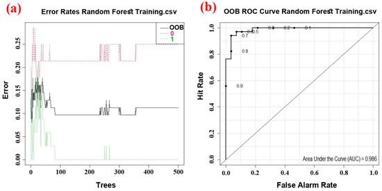 Performance of the random forest model: (a) Error rate changes with an increasing number of trees (0 non-landslide, 1 landslide), (b) ROC curve based on out-of-basket estimates.