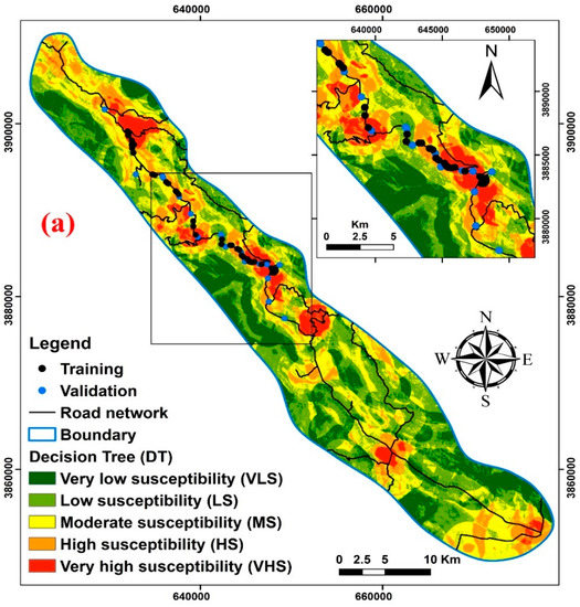 The field survey also indicated that most of the landslides are rotational slides. In total, 45 of these points were utilised for the training data, while 19 of these points were employed in the validation dataset. Then, using the training data and all conditioning parameters, three standard MLAs—RF, DT, and SVM—were used to identify the landslide-prone locations. The landslide point validation dataset was then used to validate the models (Figure 4).