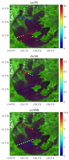 Based on the reasons above, the pixel number (PN) observable of each DDM, GNSS-R reflectivity (SR, ) and signal-to-noise ratio (SNR) of every CYGNSS data point are selected to detect the suspicious coherent signals from the lake surface. The PN observable, called the DDM spreadness, that can effectively determine the surface roughness surrounding SP sensitively [42], is employed here and defined as the number of pixels with its value > 0.1 in the normalized DDM.