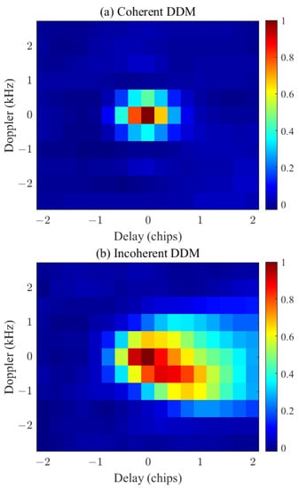 GNSS-R is sensitive to the roughness change over lake surfaces, and this change can be seen clearly in the DDMs of CYGNSS (Figure 2). The open water surface tends to be rough when wind blows [41], but when a large-scale floating object exists, it will turn smoother, making the GNSS-R reflected signals coherent [42]. The coherent reflections are easily distinguished through observables extracted from DDMs, which are also the basis of GNSS-R sea ice and oil slick detection.Once the plankton in water reproduce quickly, a kind of green paint-like substance will appear over the water surface, leading to an increase in water surface tension and reduction in the formation of waves, making the GNSS reflected signals coherent. Therefore, monitoring cyanobacteria bloom with the employment of GNSS-R is theoretically feasible. The relationship between the forward scattered GNSS signals and delay-Doppler is represented by a two-dimension function. The maximum power point in the DDM is usually associated with the SP. When the area of SP is covered by cyanobacteria bloom, the reflected GNSS signals are typically coherent, and the power is concentrated near the maximum power point in DDM, but the power will spread into a ‘horseshoe’ shape when the signals come from a rough water surface. In this way, the cyanobacteria bloom can be detected by the observables extracted from DDM (Figure 2).
