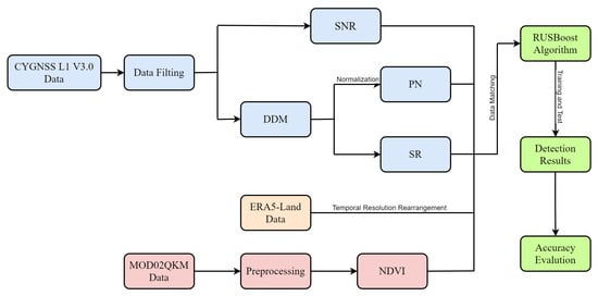 Flowchart of this research. Blue boxes are the processing steps about CYGNSS data, orange box is about ERA5-Land data, red boxes are about MODIS data and green boxes are the modeling and evaluation steps.