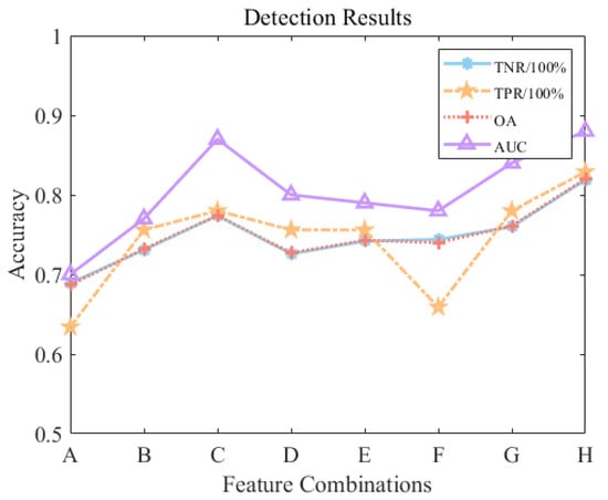 Another performance index suitable for evaluating the imbalanced data classification effect is area under curve (AUC), also employed here for evaluating the performance of the RUSBoost algorithm. In addition, AUC is an indicator calculated from the receiver operating characteristic curve (ROC; it is in the coordinate system where the TPR is on the y-axis and the false positive rate (FPR) is on the x-axis [45]), which is the size of the area under ROC and also shows the performance of the classifier. The detection results of different feature combinations are listed in Table 2, and the visualization of Table 2 is shown in Figure 6. We considered eight different feature combinations, and they can be roughly divided into three groups: only GNSS-R observables (combination A in Table 2); GNSS-R observables + all employed meteorological factors (combination H); and GNSS-R observables + one of the employed meteorological factors (combinations B-G). In these three groups, one can come to the conclusion that the involvement of meteorological factors can apparently improve the detection accuracy, while the contributions of each meteorological factor are varied. When no meteorological factors are involved, the accuracy results for cyanobacteria bloom detection (TPR), clean lake surface detection (TNR), OA and AUC are 63.4%, 68.9%, 68.7% and 0.70, respectively. Compared with the threshold value method used before, there is almost no significant improvement in the combination of the three observables, but the application potential of GNSS-R in this field can still be proven because the AUC value here is greater than 0.5, which indicates the effectiveness of the imbalanced data classification. After all the meteorological factors were engaged, the performance indexes improved a lot and were able to reach 81.9%, 82.9%, 82.0% and 0.88 in the four performance indexes, respectively, gaining 10–20% more than before, showing the prospect of the GNSS-R cyanobacteria bloom detection method by taking meteorological factors into consideration. Through doing so, some disturbing factors are excluded. For instance, on one certain day, the wind speed is quite low, so the coherent reflection from the lake surface is received such that it looks like cyanobacteria bloom exists, but the temperature on this day, or in the period ten days before, is lower than 10 °C (which hinders cyanobacteria growth), so the possibility of cyanobacteria bloom occurrence can be ruled out. This proposed method effectively overcomes the shortcomings of GNSS-R data (failure to identify the actual reason that leads to the smoothness of the lake surface). Then, the contributions by single meteorological factor to the final result were evaluated. In Table 2 and Figure 6, the performance of combination B-G is better than that of combination A but worse than that of combination H. This means that the six meteorological factors involved are effective in the research, and considering all of them can produce the best result. Temperature (combination C) and solar radiation (combination G) contribute most compared to other factors. The two combinations improve by 8.7%, 7.4% in OA, 14.6%, 14.6% in TPR, 8.5%, 7.1% in TNR and 0.17, 0.14 in AUC, respectively, relative to combination A. The result that temperature and solar contribute most to cyanobacteria bloom detection fits the conclusion in [43] well, in which it is found that suitable light and temperature are the key factors that affect the growth of cyanobacteria bloom.