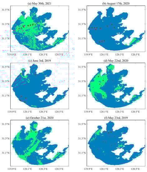 To better find the error sources in the detection results, we mapped the correctly classified and misclassified points on a day together. Through the observation, we discovered that the misclassified points mostly appear near the edge of the actual cyanobacteria bloom-covered zone. On 30 May 2021, cyanobacteria accumulated and covered almost the entire lake (Figure 7a). On this day, 11 CYGNSS points were available in the test dataset, and they all correctly classified as positive for the existence of cyanobacteria bloom, showing the great accuracy of the proposed method. On the days that nearly no cyanobacteria bloom occurred, such as 17 August 2020 (Figure 7b), the detection results are also satisfactory, and mistakes are seldom seen in this situation. Therefore, we conclude that the detection accuracy of this method is reliable when the surface condition is rather uniform (no cyanobacteria bloom or massive coverage). As Figure 7c shows, our method also shows the ability to identify the cyanobacteria bloom zone to a certain degree when a small amount of cyanobacteria bloom exists. Misclassification usually occurs when the lake is partially covered by cyanobacteria bloom. We take 22 May 2019 and 11 October 2020 (Figure 7d,e) as examples where half of the total points are classified incorrectly (3/7 and 4/8, respectively). By inspecting the misclassified point locations with the cyanobacteria bloom area on that day, the misclassified points usually are located not far away from the cyanobacteria bloom zone, which covers a considerable area of the lake. We speculate that the probable reason for it is that the cyanobacteria bloom zone nearby not only limits the wave height in the zone itself but also the surrounding area, even the whole lake. Although this situation is a kind of misclassification, it does not influence the application value of this method seriously, as it can detect the possible cyanobacteria bloom existence in the lake, especially for some real-world applications, where exact edge information is not required. Relative to optical remote sensing data, it has progressed a lot since this method can warn of the dangers of cyanobacteria bloom occurrence during overcast weather, but optical data are not accessible. Another kind of misclassification is from the confusing weather conditions. On 23 May 2019 (Figure 7f), most points are judged incorrectly (11/13). On this day, only some parts of the lake surface are covered by cyanobacteria bloom, but the average wind speed near the SPs is mostly less than 3 m/s, leading to coherent reflection from the lake surface, while the average wind speed ten days before the day is around 3.5 m/s. The average temperature is more than 21 °C, and the average atmosphere pressure is around 1010 hpa on the observing day and ten days before, which are generally suitable for the growth and gathering of cyanobacteria, but not much cyanobacteria bloom actually emerges. This phenomenon is not usual in the research period. It needs to be pointed out that despite the involvement of meteorological factors successfully reducing the misclassification to a large extent, they still cannot overcome it completely. More countermeasures remain to be proposed in the future to further decrease the misclassification rate of GNSS-R algal bloom detection.
