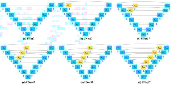 UNet with additional decoder branch of varying depths. (a) UNet7. (b) UNet27. (c) UNet37. (d) UNet47. (e) UNet57. (f) UNet67 (ADD-UNet). The blue and yellow boxes correspond to multi-channel feature maps. The blue downward arrows indicate convolutional layers, the blue upward arrows indicate deconvolutional layers. The gray arrows indicate skip connections.