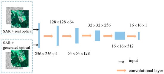 In this paper, the discriminator employed is based on a 5-layer convolutional neural network (CNN) structure, as depicted in Figure 2. The architecture follows the PatchGAN design, which focuses on analyzing local image patches rather than the entire image. This approach allows for a more fine-grained evaluation of the generated images, enabling the discriminator to provide detailed feedback and guidance to the generator network. The optical image and the conditional SAR image are input together into the network through channel concatenation. The output of the discriminator is a 16 × 16 matrix. Each pixel in the matrix represents the probability that its corresponding patch in the input optical image comes from a real optical image rather than a generated one. The pixel value is in the range of [0, 1]. “1” means that the patch is from a real optical image, and “0” means that the patch is from the generated optical image.