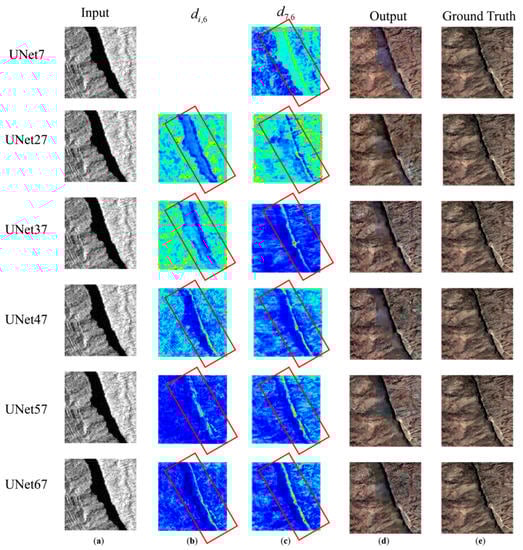 Feature visualization of UNet with an additional decoder of varying depths. The image from the first line to the sixth line are feature maps of UNet7 to UNet67. From left to right are: (a) single-channel SAR image input; (b) heatmap of the last layer at shallow decoder; (c) heatmap of the last layer at deeper decoder; (d) output generated image; and (e) ground truth (SEN-2 optical image).
