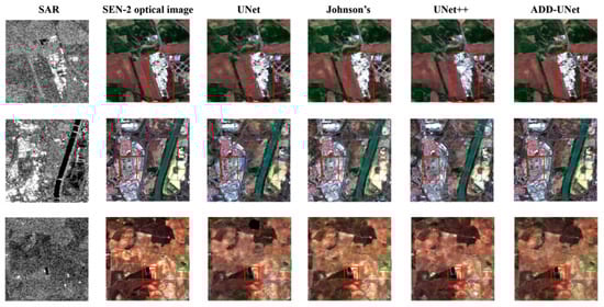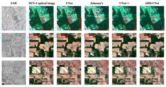 Figure 4 presents translation results by the proposed ADD-UNet and other advanced networks on the Test1 dataset. The examples generated by ADD-UNet and UNet++ have better structures and details than those by UNet and Johnson’s. As marked with red boxes in the first row of Figure 4, a border line is across the middle of the forest in the original optical image. The border line is almost missing from the results of UNet and Johnson’s. However, most of the border line is restored in generated images by both UNet++ and ADD-UNet. In the second row of Figure 4, the generated images by ADD-UNet and UNet++ are sharper than other methods and both of the methods can restore the long line along the building block within the red box. From red boxes of the third row in Figure 4, both ADD-UNet and UNet++ recovered the U-shaped crack structure feature while other methods did not. In summary, both UNet++ and ADD-UNet perform better in keeping structural features, detail fineness, and outline sharpness than UNet. Furthermore, the parameter quantity of ADD-UNet is much lower (27.6%) than that of UNet++, and this is the advantage of ADD-UNet.