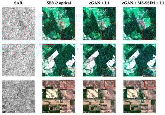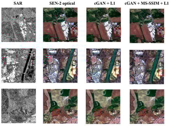 Figure 6 presents the translation results of the proposed loss function and (cGAN + L1) on the Test1 dataset. In the first row, with the proposed loss (cGAN + MS-SSIM+ L1), the border line in the forest within the marked red boxes is restored longer than that with the loss (cGAN + L1). In the original optical of the second row, a small white path is within the red box. The generated image of our proposed loss restores the path better than that of (cGAN + L1). Then, the generated samples with the proposed loss have the advantage of preserving more realistic structural features and details than that with (cGAN + L1). As highlighted with red boxes of the third row, our loss function can generate clearer contour of the U-shaped detail. Overall, our proposed loss function (cGAN + MS-SSIM+ L1) performs better than the loss function of (cGAN + MS-SSIM + L1), and it has a better ability to keep structure features and detail fineness.