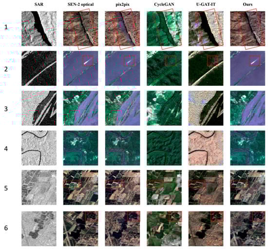 Figure 8 shows the results of different methods of SAR-to-optical translation on the Test1 dataset. Compared with other methods, images generated by our method have more realistic details. The first row presents a ridge line. From the SAR image, both the ridge line and the rock to the left of it are dark, appearing to be a “wider gap”. In the generated images by CycleGAN and U-GAT-IT, the colors are incorrect, and the ridge line and the rock to its left have been incorrectly restored to the same category of landform that looks different from the background. In the generated image by pix2pix, although the rock on the left can be distinguished from the ridge line, the texture and structural features of the rock are not accurate. Our method is the only method of recovering both the ridge line and the texture characteristics of its left rock surface. As marked with red boxes of the second row, the optical image of SEN-2 exhibits a rectangular-like bright spot on the water surface. Our method clearly restored the structure of the bright spot while other methods failed. From the third to the fourth row, compared with results of other methods, the colors, and texture features of images produced by our method are closest to real optical images. The images generated by CycleGAN and U-GAT-IT contain structures close to the ground truth, but their color information is wrong. For images generated by pix2pix, their colors are closer to the ground truth, but they seem noisy and unclear. In the red boxes of the fifth and sixth row, the farmland structure restored by our method exhibits richer details and shaper outline than other methods.