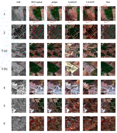 Figure 9 shows the results of different methods on the Test2 dataset. In the first row, only our method restored the structure of the long road within the red box. In the second row, our method recovered the line structure in the farmland, and is shaper than pix2pix. From row 3 (a), the SEN-2 optical image presents a curved black structure within the red box and the magnified view of the structure is shown on row 3 (b). Our method accurately restored this structure while other methods failed. From the images of the fourth to sixth row, the structural details and texture restored by our method are closest to ground truth.