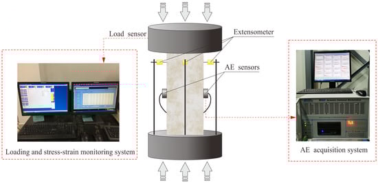The uniaxial compressive equipment used in this study mainly consists of loading system, stress–strain monitoring system, and AE acquisition system, as shown in Figure 2. The loading system has a loading capacity of 2000 kN and the PCI-II AE system was adopted to monitor AE signals during loading process in real time. The load was applied by displacement control and set with the rate of 0.06 mm·s−1. Compared to displacement rate, strain rate, which measures the rate at which the material is being stretched or compressed, is a better measure for studying the behavior of materials under deformation, because strain rate considers both the amount of deformation and the rate at which it occurs [45,46,47,48,49,50]. According to the provided displacement rate for the compression test and the rock dimension, the strain rate can be calculated, which is 6 × 10−4 s−1.