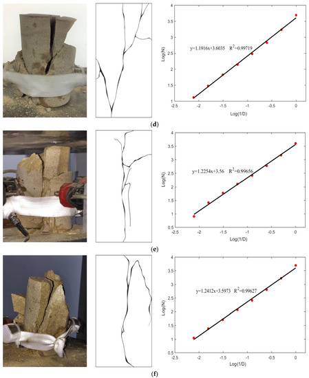 In order to make the quantitative comparison of failure characteristics for these three types of specimens, the crack morphology image of the main fracture surface is converted into binary black-and-white images to reveal an effective profile of the cracks (see Figure 3). The traditional definition of dimension is expanded by fractal dimension, which indicates that the more complex a curve is, the larger its fractal dimension [63]. In this paper, the fractal dimension of cracks is measured by the box dimension method, which can produce a self-similarity analysis of complex lineaments, such as fracture networks. The calculation process can be summarized as follows: Firstly, divide the image set F into a grid with side length δk and calculate the number of grids (Nδk) covering the region of the image. Then, if F has fractal characteristics, it can be determined and expressed as follows: