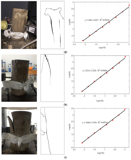 Failure modes and fractal dimension results of rock specimens under different water-bearing states: (a) D−1; (b) D−2; (c) D−3; (d) N−1; (e) N−2; (f) N−3; (g) S−1; (h) S−2; (i) S−3. Note that the red data dots represent the number of boxes required to cover the cracks corresponding to different box edge lengths.