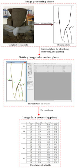 Image-Pro Plus 6.0 (IPP 6.0) software has powerful image processing and analysis functions that can directly extract image data from pictures obtained by microscopes, cameras, or scanners. After the binarized black-and-white image is imported into the IPP software, the IPP software can realize automatic identification, numbering and statistics of cracks, and record the center position and measure the length of each crack. The crack procession flowing chart using IPP is drawn in Figure 4. The data results are exported to Excel for processing, and the final statistical results are shown in Table 2. The results for the total generated crack lengths for rock specimens in three groups are as follows: (1) for specimens in the dried state: D-1 (207.329 mm), D-2 (246.289 mm), and D-3 (334.264 mm); (2) for specimens in the natural state: N-1 (244.082 mm), N-2 (231.115 mm), and N-3 (206.335 mm); and (3) for specimens in the saturated state: S-1 (204.101 mm), S-2 (123.511 mm), and S-3 (147.884 mm). Overall, it can be seen that with the increase in water content, the total lengths of the cracks generated from rock specimens have decreasing trends.