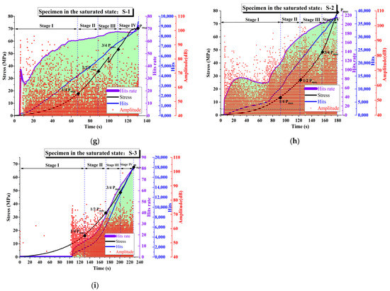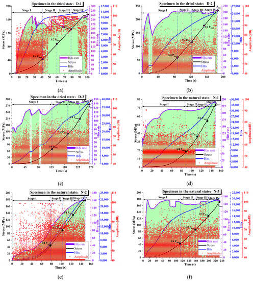 Figure 5 shows the evolution process of AE parameters including AE hits, the hit rate, AE amplitude, and axial stress versus the time of sandstone specimens under three different water states, respectively. In order to provide a criterion for the stage division, the signs of σ and σmax are used to denote the applied axial stress and the axial peak stress, respectively. According to the evolution trend of the uniaxial compressive stress and detected AE hits, the four stages are divided as follows: Stage I (0 < σ¼1/4σmax), Stage II (1/4σmax < σ½1/2σmax), Stage III (1/2σmax < σ¾3/4σmax), and Stage IV (3/4σmax < σ < σmax). As shown in Figure 5, the purple curve represents the variation of the AE hit rate with time; the black curve represents the variation of uniaxial compressive stress with time; the blue curve represents the variation of the AE hit number with time; and the red dot represents the AE amplitude distribution.