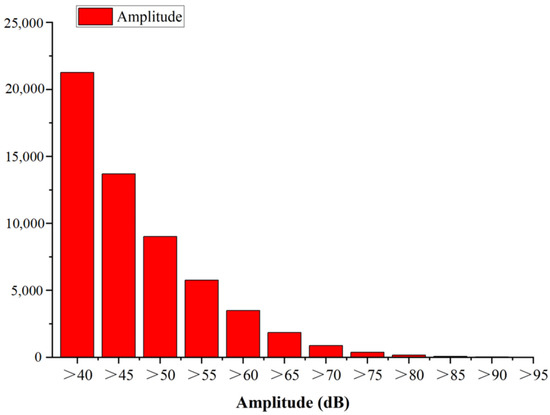 where AdB (dB) means the peak amplitude of the acoustic emission event, and N is the incremental frequency, indicating the number of acoustic emission hits with an amplitude larger than AdB [68,69].
