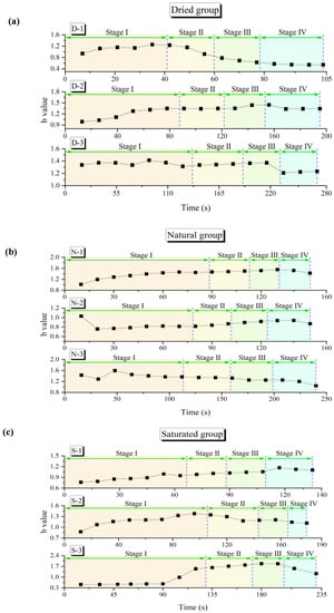 The same calculation process is performed on other specimens, and the variations in the b-value for all of the specimens versus four loading stages are given in Figure 8. The b-value curves of all the specimens are not smooth with obvious fluctuations, which are caused by rock non-homogeneity and crack development complexity. During Stage I, the b-values fell in the range of 0.9–1.4 for dried rocks, 0.7–1.6 for natural rocks, and 0.5–1.6 for saturated rocks, respectively. For saturated rocks, a few AE hits were generated, resulting in more discrete b-values.