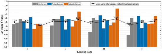 In order to better compare b-value evolution properties, Figure 9 presents the average b-value at four stages for sandstones in three groups. The b-value first decreases during Stage I and then increases during Stages II and III with the increasing water content. The lower b-value is obtained during Stage IV, indicating a larger proportion of macro-cracks. Moreover, the mean value of the average b-value has an obvious increasing trend with the decreasing water content, which was 1.066 for the dried group, 1.180 for the natural group, and 1.250 for the saturated group, indicating that the proportion of macro-cracks generated in dried sandstone significantly increases with large amounts of energy release and an increasingly violent failure intensity.