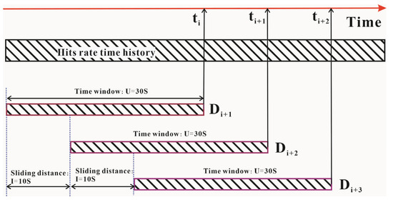 D(m) is the fractal characteristic of the AE hit rate in the measurement scale range. The fractal dimension Di is often calculated using a fixed sample capacity of m, and the time Ti corresponding to the first or last parameter of the sample is actually the scale of the fractal dimension Di. As m increases, the straight line slope Di should gradually converge to a stable value; otherwise, the sequence set is a random sequence. In this paper, the G-P algorithm is used to calculate the fractal dimension Di of the AE hit rate. Taking the AE test data as a sample that has the fixed time window of U, the fractal dimension Di of a single AE hit rate can be calculated, and the time ti corresponding to the end of the time window is used as the scale of Di [75,76,77]. On this basis, the fractal dimension of the AE hit rate in the whole rock failure process is calculated with a fixed step distance I. Moreover, the fixed time window U is set to 30 s, and the sliding window I is set to 10 s. The calculation method of the AE fractal dimension is illustrated in Figure 10.